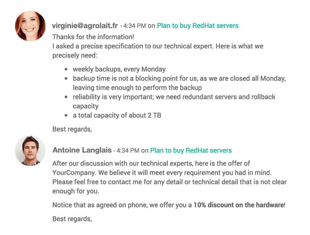Recibe alertas personalizadas de actividades relevantes, envía correos electrónicos directamente desde las cotizaciones y mantén registros completos de tus negociaciones de forma automática.